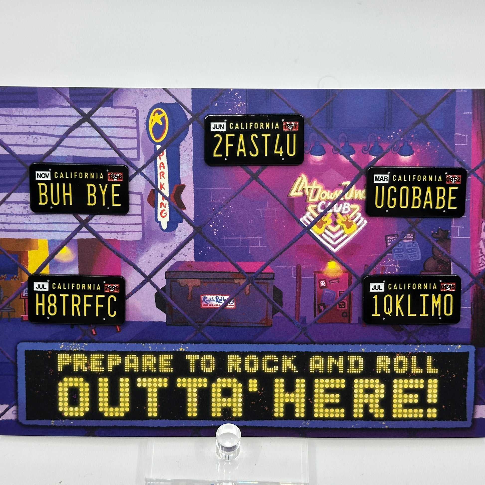 Cruise in rock-star style at 57 miles per hour with the Super Stretch Limo License Plate Pin Set — inspired by the iconic high-speed getaway vehicle from Rock ’n’ Roller Coaster! This collectible pin set celebrates the legendary ride featuring the 5 different license plates adorning the ride vehicles.
